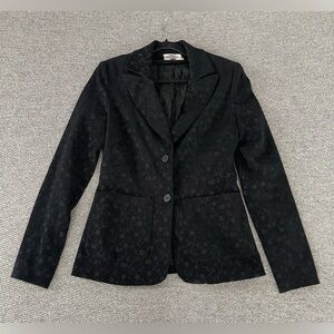 This black blazer is crafted from a structured material, providing a tailored fit that enhances its formal appeal. The subtle texture adds a unique touch, making it ideal for sophisticated occasions. Its classic design ensures timeless elegance.