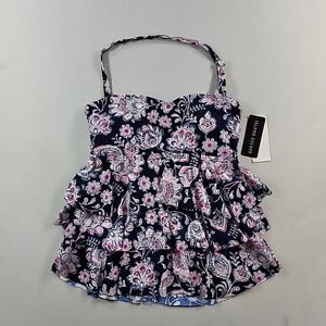 ISLAND ESCAPE Bandini Swimsuit Top Womens Navy Floral Stretch Removable Cups Lined Convertible Tiered Santa Barbara $44