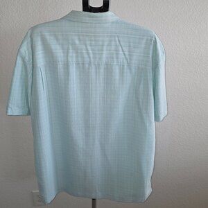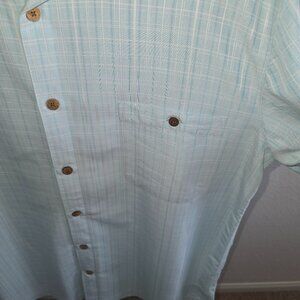 ISLAND SHORES MENS XL GREEN AND WHITE SHORT SLEEVE PLAID SHIRT 62% VISCOSE AND 38% POLYESTER.