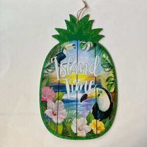ISLAND TIME Pineapple Tiki Bar Beach Sign Luau Door Wall Decoration Parrots