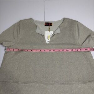 • Details: Split neckline, short sleeves, metallic sheen, layered look