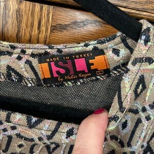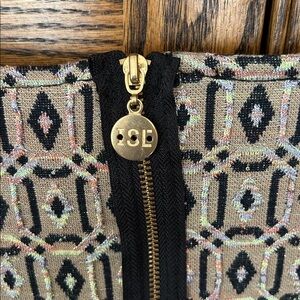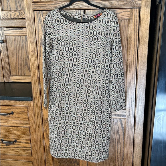 Tan geometric print with multicolored detail and metallic threads throughout. Zipper up the back. Long sleeve mini dress