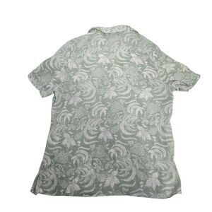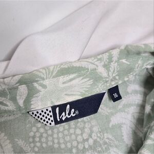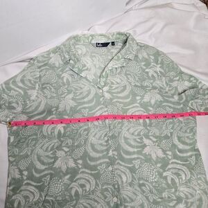 Light green tropical print button up coastal short sleeve beach shirt by Isle. UK brand so please refer to measurements for fit. 100% cotton.