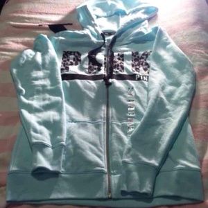 ISO this white VS Pink full zip with tropical floral print. I need this in my life haha and every time I find one in my size - small or x small - it's already sold 😢😢 also ISO the baby blue and cheetah/leopard print full zip hoodie