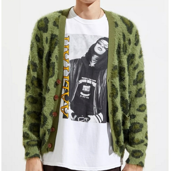 Green, fuzzy, leopard print cardigan from Urban Outfitters.