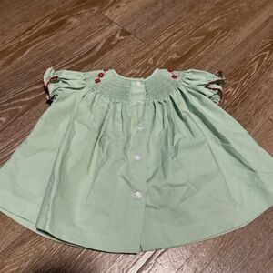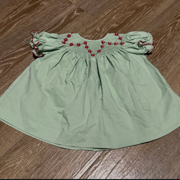 green kids dress/outfit with red accents