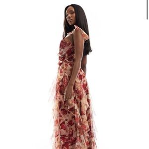 ISO ASOS LACE&BEADS RUFFLE MIDAXI DRESS IN DEEP ROSE PRINT
