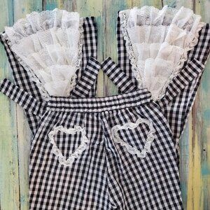 ‼️ ISO: DO NOT BUY‼️"out of stock on website! black and white checkered plaid pants with lace frill & bow details, nonfunctional lace heart pocket design by bobon21"