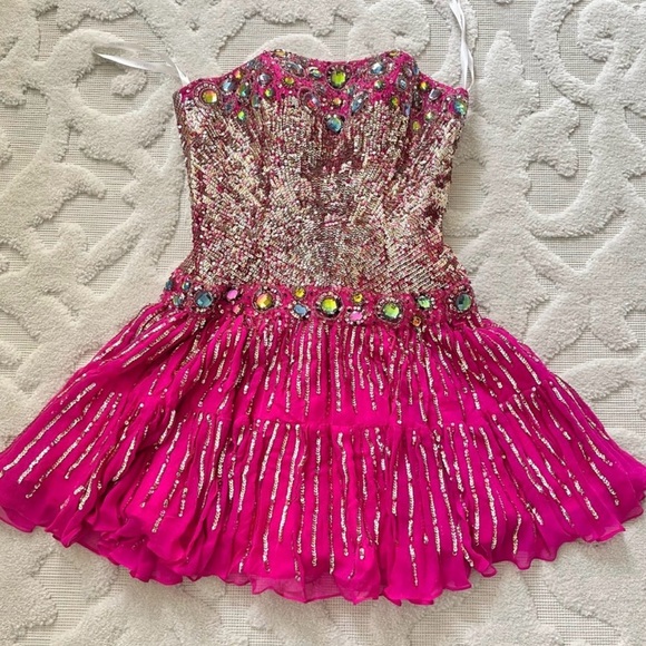Stunning mini dress with vibrant pink skirt. Gold embellishments add sparkle. Perfect for special occasions.