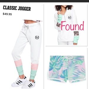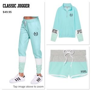 I have the palm print quarter zip in a size S and the mint and pink joggers in a small. I also have the mint tee in the cut out cool and comfy pic.