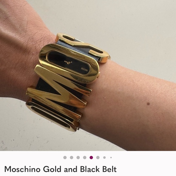 Bold Moschino bracelet with striking gold letters on a sleek black band. Ideal for making a fashion statement.