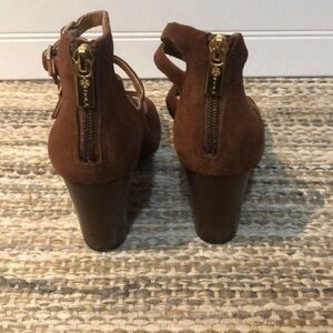 ⦁ Style: Brown Suede outsole with a strappy appearance and multi adjustable buckle detailing. With a block-heel, lightly padded footbed, and a peep-toe. A classic design making them the perfect heel to wear with skinny jeans on a night out.