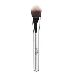 Airbrush Flawless Foundation Brush #104 by IT Brushes For ULTA is a medium sized, flat paddle with a thin, tapered head offers smooth, light application. Great for buildable foundation! Features a soft tapered tip, easily maneuverable for all areas of your face . Airbrush finish blurring synthetic brush hair. Handle is lightweight, durable, rounded comfort-grip.