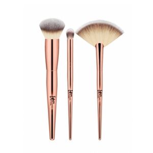 A three-piece full-size luxury brush set featuring a foundation, highlight and eyeshadow brush + a cute travel bag that stores everything!