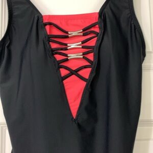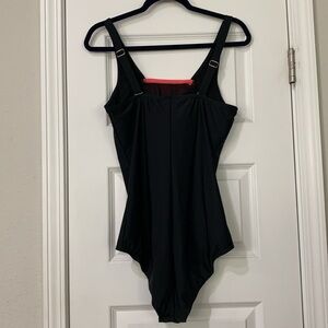 Suit features a striking black design with a vibrant pink accent, perfect for any occasion.