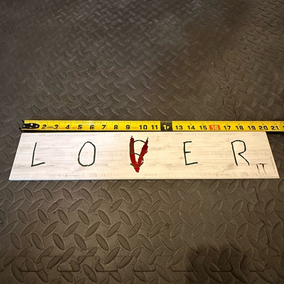 White wooden sign with 'LOVER' text from the movie IT