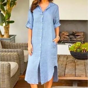 ITALIAN LINEN BUTTON-DOWN MIDI DRESS THIS MIDI-LENGTH DRESS IS CONSTRUCTED FROM SOFT, LIGHTWEIGHT 100% ITALIAN LINEN. FEATURING A BUTTON-DOWN FRONT AND COLLAR, EMPIRE WAIST SEAM, AND LONG SLEEVES, THIS DRESS OFFERS A POLISHED, EFFORTLESS LOOK THAT CAN BE DRESSED UP OR DOWN. TIMELESS AND CLASSIC, PERFECT FOR ANY OCCASION.