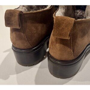 The ITALY BOEMOS Hiking Real Fur Suede Leather LaceUp Lug Sole Combat Biker Boot 39 is a stylish and versatile boot designed for women who love outdoor activities such as hiking and biking. Made in Italy with high-quality leather and real fur suede, these boots feature a lace-up closure, a rounded toe, and a low stacked heel for comfort. The removable fur insole adds warmth during colder seasons, making them perfect for winter, fall, and spring adventures. With a solid brown color and a classic lace-up design, these boots combine fashion with functionality for the modern outdoor enthusiast.