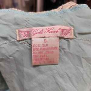 Featuring 100% silk, light aqua blue bodice, cream lace trim, lace flower embroidery, and fixed length straps.