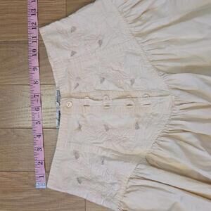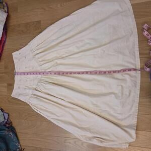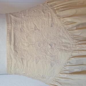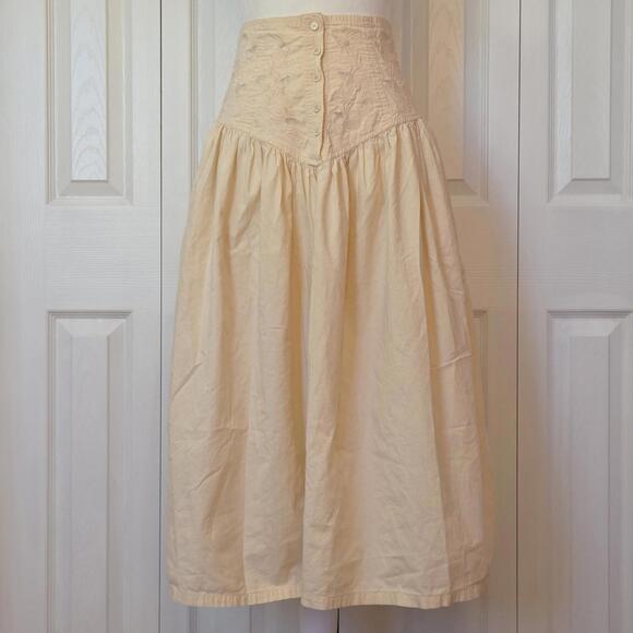 Features: cream / beige 100% cotton fabric, floral embroidery and lace cutwork corset waist with pointed yoke, button front closure, hidden pockets, gathered skirt, midi length