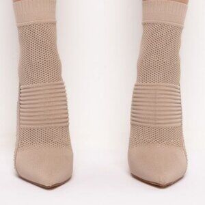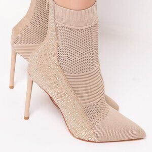 We’ve got a feeling that you’re gonna love It's A Given Showstopper Stiletto Bootie. This ultra-chic mid calf sock boot features an unlined mesh knit upper, rhinestone gemstone side stripe detailing, a pointed toe silhouette, a slim stiletto heel, and a tonal back ankle zipper.