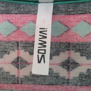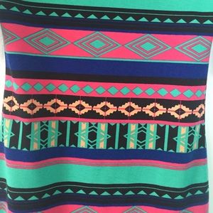 Very colorful and fun. It can be worn any season depending on how you accessorize it. Black leggings look great under it in the winter with black boots or booties. The orange can be drawn out in the fall and the tea and pink can be played with in the spring or summer. It's tight fitting.