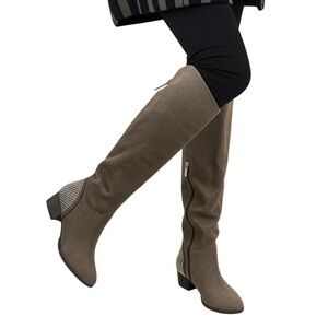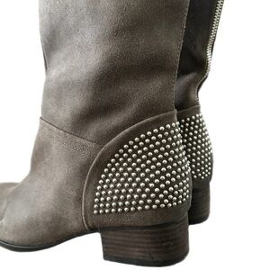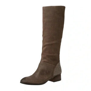 The Ivanka Trump 100% Leather Boots are stylish and edgy, featuring a unique design with studded accents and an almond toe shape. These knee-high boots have a low block heel for added comfort, making them perfect for various occasions.