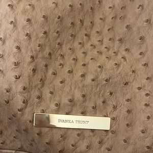 Exterior: Faux Ostrich Vegan Beige Leather., has Ivanka Trump Goldtone name plate on front center, has Goldtone hardware with “T” embossed near handles. Also has a-few hanging charm adornments. Back has magnetic button closure large compartment.