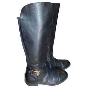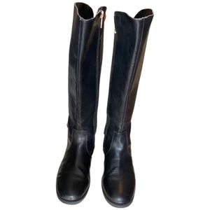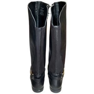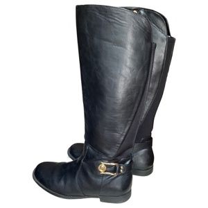 Cool riding boots style by IVANKA TRUMP…..THE “Overland”……I’ve the knee…black boots..strap and buckle accent ….zipper at side for closure……gold tone hardware detail at strap….elastic at the back….round toe…pre-loved in good condition