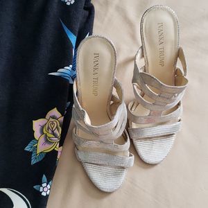 IVANKA TRUMP super high-heels, embossed gold finish, strappy feature. these shoes are super super comfortable even though they are so high. the stiletto heels measure 4.5" from the base of the foot to the bottom point. the entire shoe is in great condition, i wore it once for a weekend wedding that was mainly indoors. the footbed is in clean condition, w/ slight imprint at toe box but definitely reflects a barely worn look. the bottom outsole and heel are in great condition! casual or dressy!