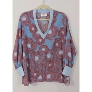 IVI Collection 100% Silk Blouse Light Blue Poppy Floral V neck Long Sleeve Sz 36