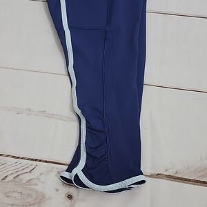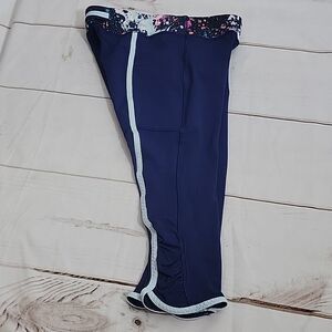 Ivivva Athletic Workout Capris for girl by Lululemon are amazing! The pain splatter waist give them just a little pop of color before the beautiful blue pants. These have side and a waist pocket. These are a size 12 girls.