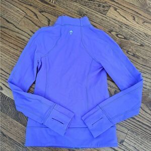 Stretchy athletic track jacket in purple. Large front logo in a minty yellowish green and purple space dye. Front zip with logo zipper pull. Side pockets. Logo at back of neck.