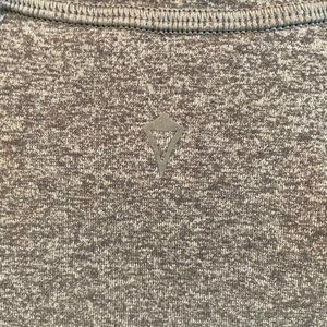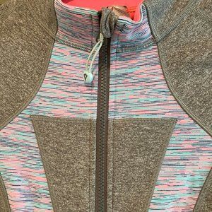 This cute little zip-up jacket is in great used condition. features multi-colored contrast design on the front, on a heathered gray background. 45% Polyester/42% Nylon/13% Elastane.
