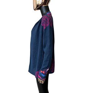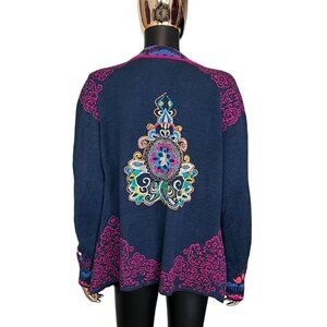 Excellent pre-owned condition with no size or fabric tags. Freshly washed in fragrance-free detergent, ready to wear. Soft, midweight knit — feels like a wool or cotton blend (not itchy). Beautifully embroidered medallion motif on the back, fuchsia jacquard patterning along the hem and sleeves, and an open-front draped silhouette.
