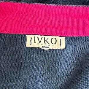 Stunning embroidered cardigan by IVKO Woman featuring vibrant multicolor detailing on a rich navy knit. A standout artisan piece with IVKO’s signature bold, intricate design work.