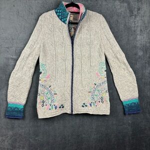 IVKO "Jacket with Embroidery" - a piece of art wool sweater in off white featuring beautiful embroidery design n aqua blue, high collar, double zip closure, long sleeves. Comfortable fit. High quality medium weighted knits. Very warm. Made in Serbia. Exquisite style, indeed! Wool - Polyamide - Viscose. Style # 72606.