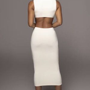 Forever mesmerizing in our Ivory Til Sunrise Midi Dress. This beautiful midi dress highlights a mock neckline with sleeveless shoulders and a seductive cutout at the waist. Double lined. Stretchy.