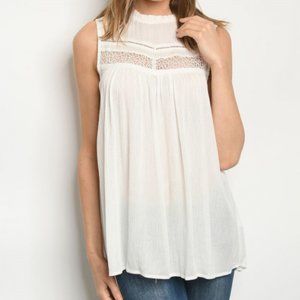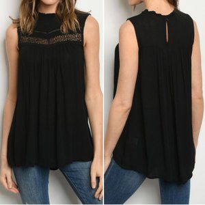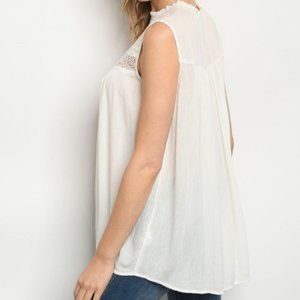 Sleeveless ruffled round neck lace trim yoke detail tunic top.