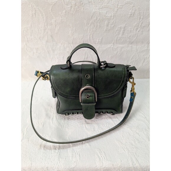 Customized IVTG green studded leather satchel purse in a vintage style green colorway. Comes with a short top handle that allows for hand carrying, a detachable adjustable crossbody strap in a retro blue, silver buckle and rivets, gold tone brass snap hooks, zippered closure, 4 Pockets - 2 Zippered, 2 open.