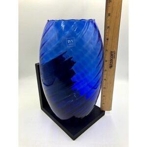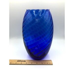 IVV Cobalt Blue Glass Vase Handmade in Italy Barrel Swirl Scallop Top Edge. RARE! I looked all over for this vase and even the Italian website doesn't even carry this anymore. It is SUCH a beauty! Please see photos for visible condition. No original box. No noticeable chips/cracks. Shelf not included. Age unknown. Approximately 9.75 inches tall x 5.5 inches wide and opening 3.5 inches. Will be shipped in a larger box for safety.
