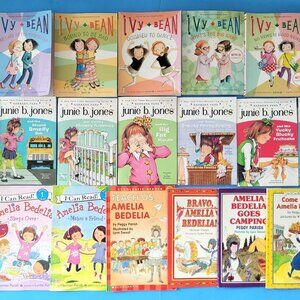 IVY & BEAN JUNIE B. JONES AMELIA BEDELIA LOT OF 22 GIRLS BOOKS I CAN READ, excellent clean condition from a smoke-free home. Books included: Ivy & Bean #3, 4, 5, 6, 7, 8, 11, 12; Junie B. Jones #1 through 6; and 8 Amelia Bedelia. Some of the books look like they were never read. There are no marks, stickers, writing, stamps in any of these books; however, Teach Us Amelia Bedelia has teacher's marks.