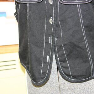 This is a vest by Ivy Collectibles. It has a western look to it. The tag says it was made in the USA. The size is Large according to the tag and it is about 19 inches long and 20 inches pit to pit. It is missing 2 buttons on the front but there is a spare (yes just one) on the inside. There is some lint and "stuff" it has picked up in the past.