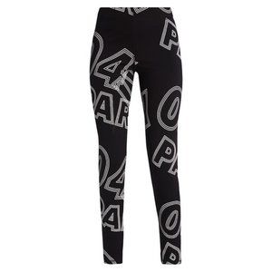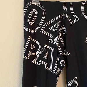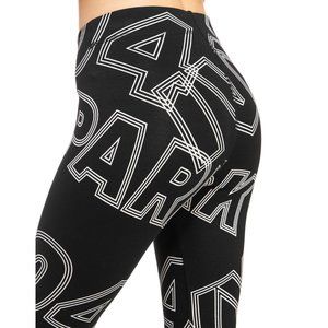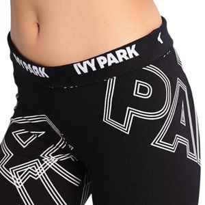IVY PARK by Beyonce women's black and white all over print athleisure leggings. All over print features IVY PARK 04 in striped block print, High-rise, logo detailing at the waistband that shows when folded over, and a super soft construction.