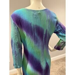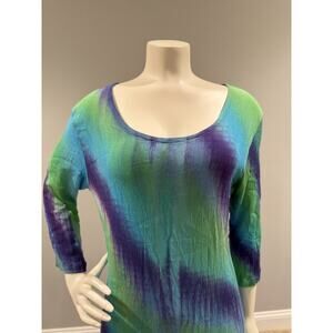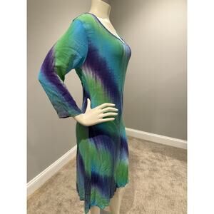 The IVY REED Women's Size Medium Blue Tropical Beach Ocean Rayon Dress is a stylish and comfortable option for casual or travel occasions. The tie-dye pattern, 3/4 sleeves, and round neckline give it a unique and artistic vibe, perfect for a day at the beach or by the ocean. Made from machine washable rayon fabric, this midi-length dress is ideal for summer and spring seasons. The bodycon style and vibrant colors add a fun and trendy touch to your wardrobe.