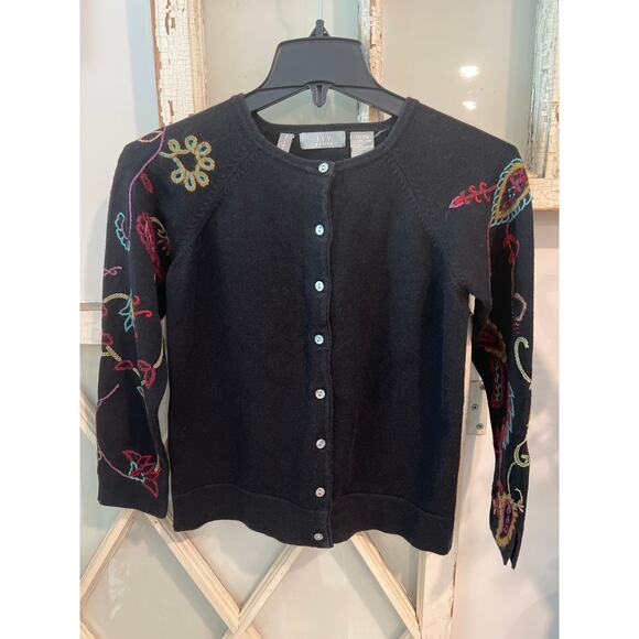 IVY size petite medium cardigan sweater. Black with beautiful embroidery. Excellent condition.