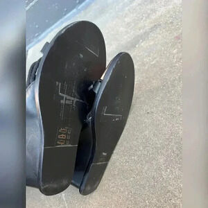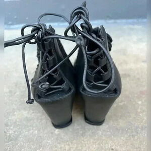 Black leather Ivy Kirzhner Mykonos wedges with rose