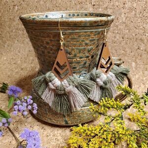 NWT Ivy Mountain Crafter macrame earrings with gold ear wires. Olive green and taupe cotton cord on cherry wood earring findings. Hypoallergenic and nickel free. New, never worn. Handcrafted by me with 💙 Smoke free home.