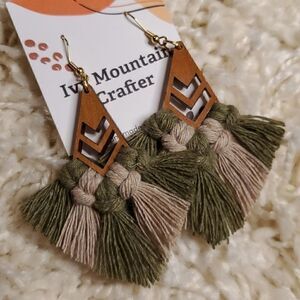 NWT Ivy Mountain Crafter macrame earrings with gold ear wires. Olive green and taupe cotton cord on cherry wood earring findings. Hypoallergenic and nickel free. New, never worn. Handcrafted by me with 💙 Smoke free home.