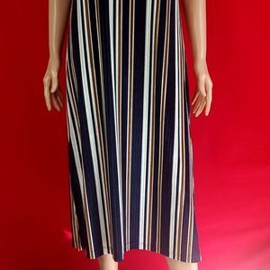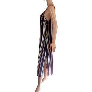 Blue, brown and white stripes velvet midi shift dress with thin shoulder straps and slits on both sides.